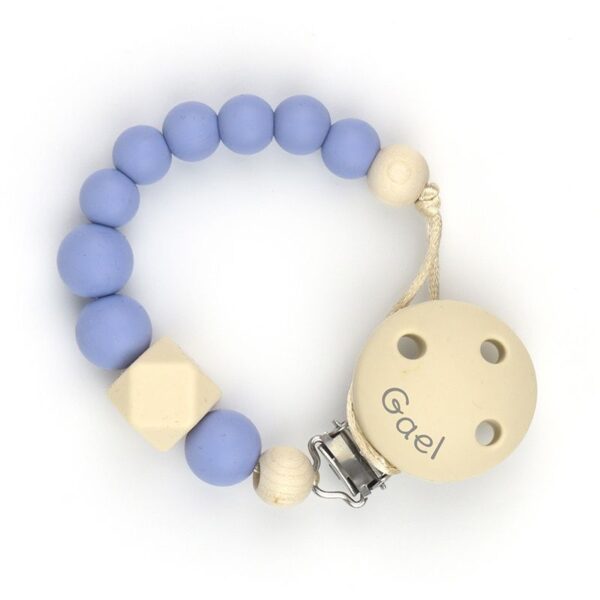 Cadena para chupete con bolas, clip y figuras de silicona de grado alimentario que se pueden morder. Montado a mano en España, diseño original Mi Pipo. Libre de BPA. Certificadas por AIJU, cumplen la normativa EN 12586.