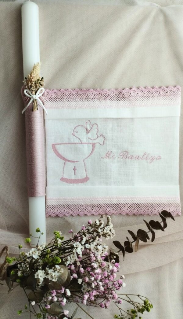 Conjunto de bautizo formado por vela adornada con cordón y flor seca y pañuelo en lino, con puntilla de hilo en color rosa palo. Hecho a mano. El pañuelo de puede bordar con el nombre del bebé y la fecha del bautizo.