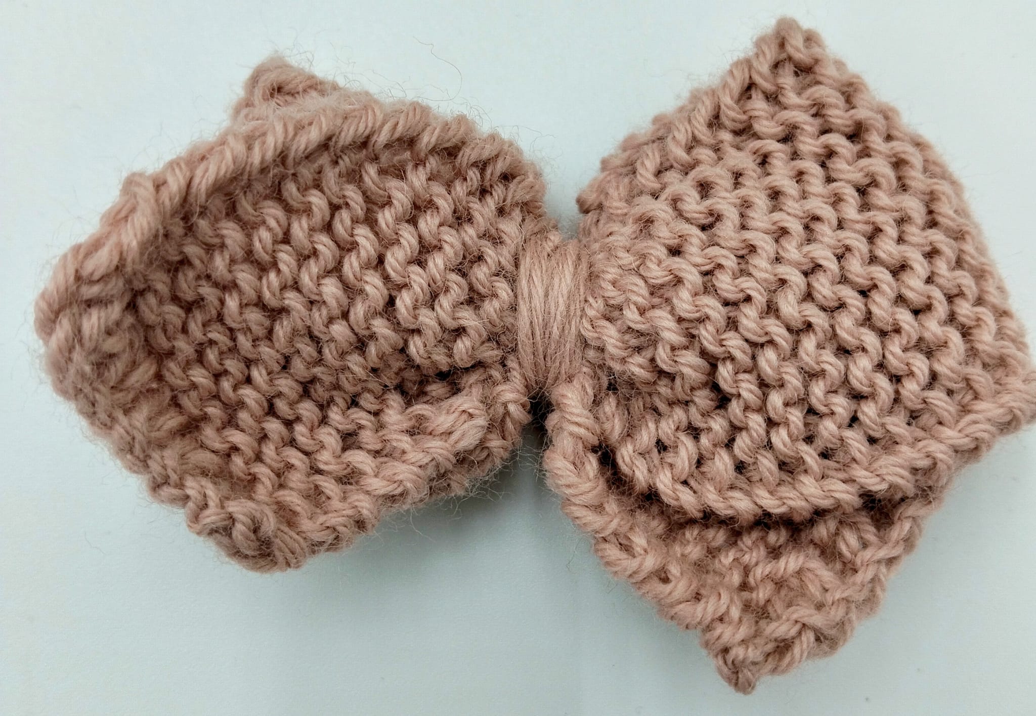 Lazo Clásico de lana tejido a mano en color rosa polo. Tamaño 11 cm aprox. Pinza cocodrilo de 5,5 cm. Ancho de la cinta 4 cm aprox.
